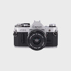 The Canon AE-1 is one of the most iconic 35mm SLR cameras, known for its reliability and ease of use. It introduced shutter-priority automation, making it simple for beginners while still offering full manual control for those who want to learn and experiment. Paired with the 35mm f2.8 lens, it’s a versatile setup ideal for landscapes, street photography and everyday shooting, giving a natural wide-angle perspective. With its solid build and straightforward controls, the AE-1 remains a timeless choice for anyone looking to get into film photography.
