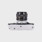 The Canon AE-1 is one of the most iconic 35mm SLR cameras, known for its reliability and ease of use. It introduced shutter-priority automation, making it simple for beginners while still offering manual control for those wanting to take full creative charge. Paired with the fast 50mm f1.4 lens, it delivers excellent low-light performance and beautifully sharp images with shallow depth of field, perfect for portraits and everyday photography. With its solid build and timeless design, the AE-1 remains one of the most popular choices for anyone looking to get into film photography with a classic setup.
